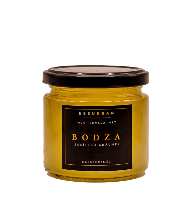 Termelői akácmézben bodza virágok áznak, ez adja a méz természetes bodza izét.