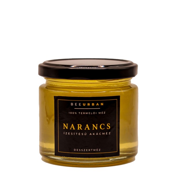 Termelői akácmézben narancshéjak áznak, ez adja a méz természetes narancs izét.